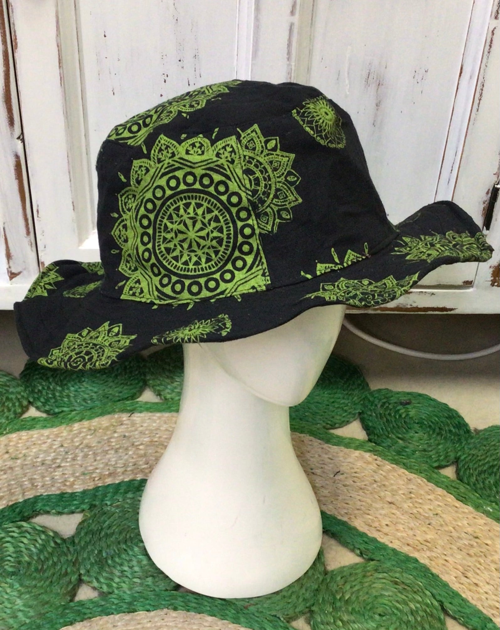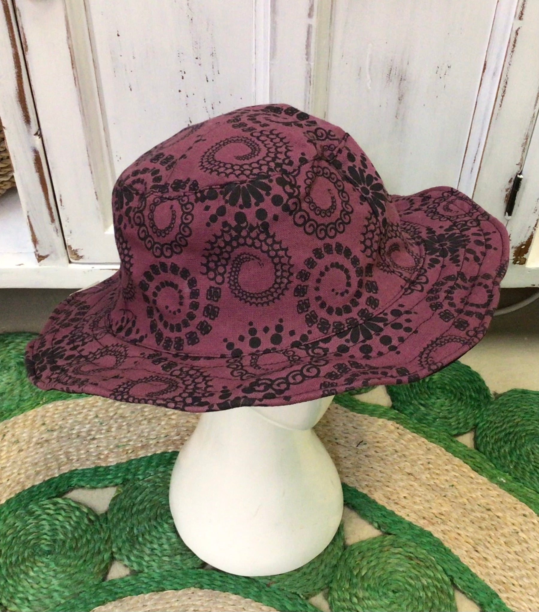 Cotton printed hat with wire shaping brim on edge. Fully lined inside. Made in Nepal