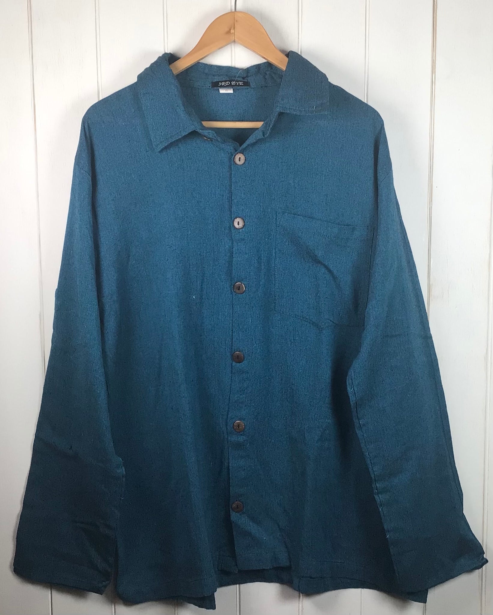 Cotton Long sleeve shirt with collar. Coconut shell full button up in front. Side pocket on front left . Open sleeve that can be rolled up .