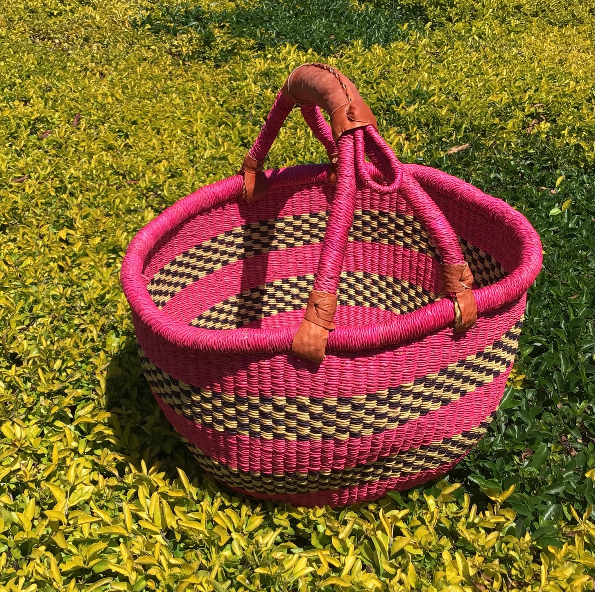 These baskets are hand woven in villages in Ghana. They use elephant grass and natural dyes. Ethically sourced and environmentally friendly, preserving traditional craft and skills. Comfortable leather carry handle.