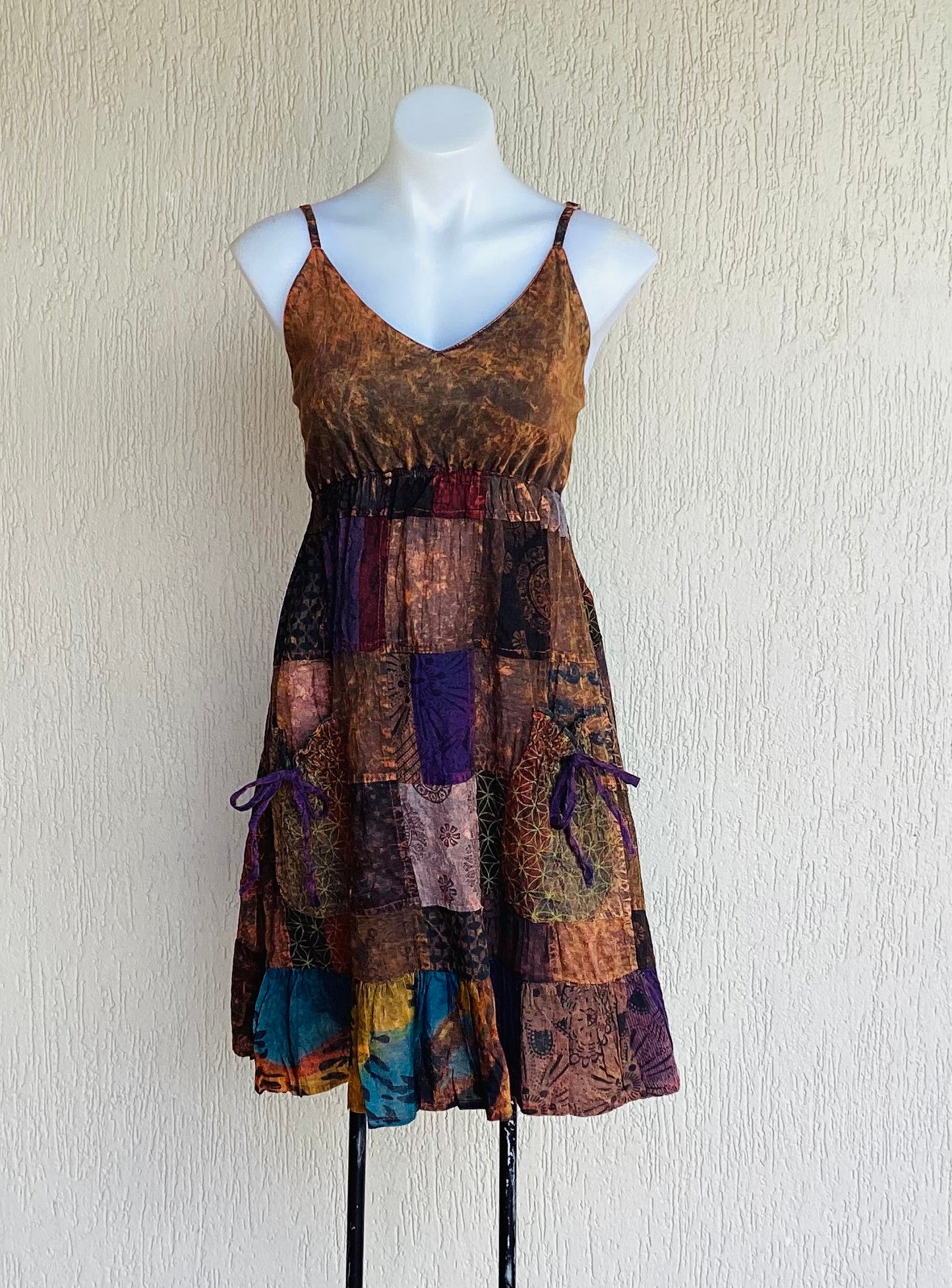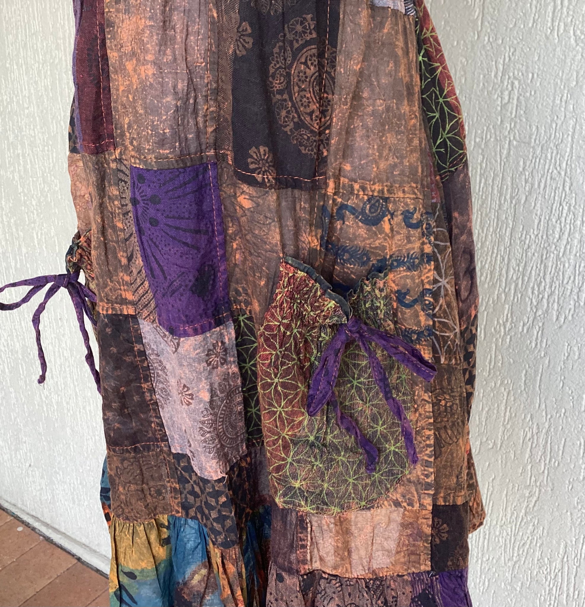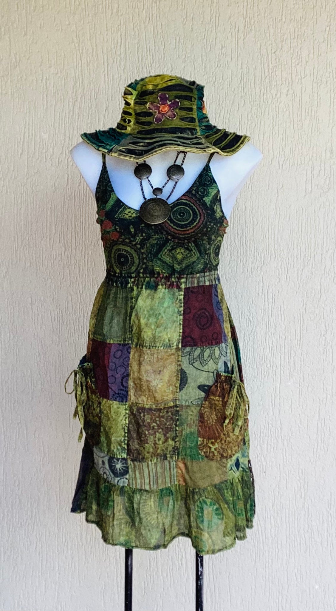 100% cotton. Adjustable straps. Shirred elastic at the back. Two pockets.