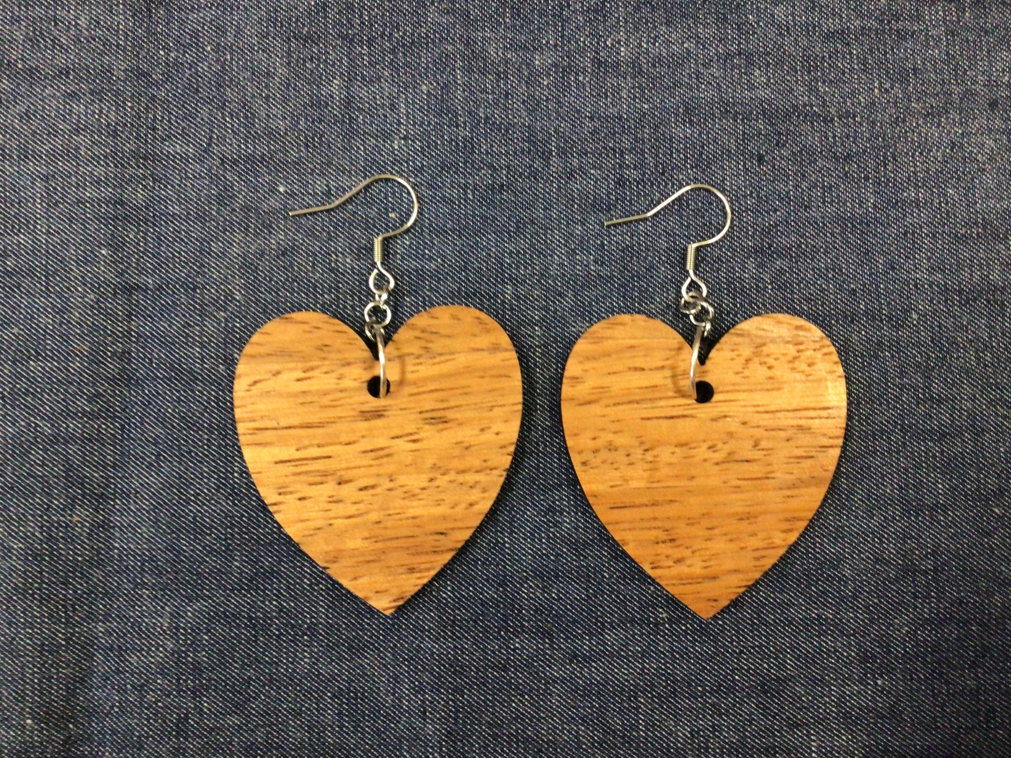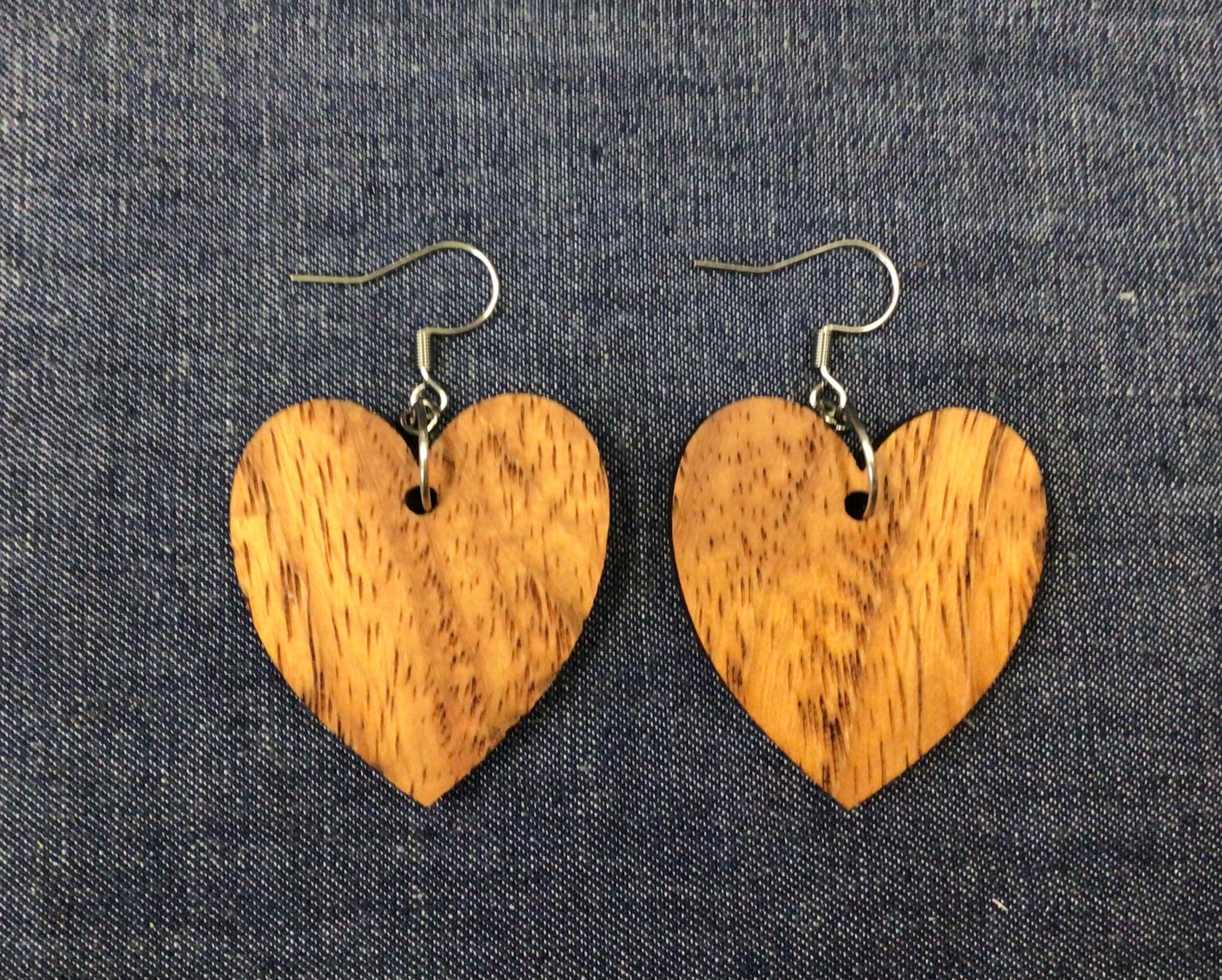 These earrings are made from off cuts of Rosewood timber doors. The recycled pieces are sliced into 5mm thickness with a band saw. The slices are then run through a two stage drum sander, and then an orbital sander to sand with 120 to 400 to 600 and finally 800 grit. Once the timber is nice and smooth the craftsman then decides if it will be stained with a darker shade. The timber is then taken to a CO2 laser machine and cuts out the designs. Then a mix of Tung oil and liquid bees wax is rubbed into the earring by hand. It is left to dry for a few days. Once dry they are then rubbed down again with a clean cloth to remove any wax build up and are given a final polish. They have stainless steel hooks and jump rings added to them.