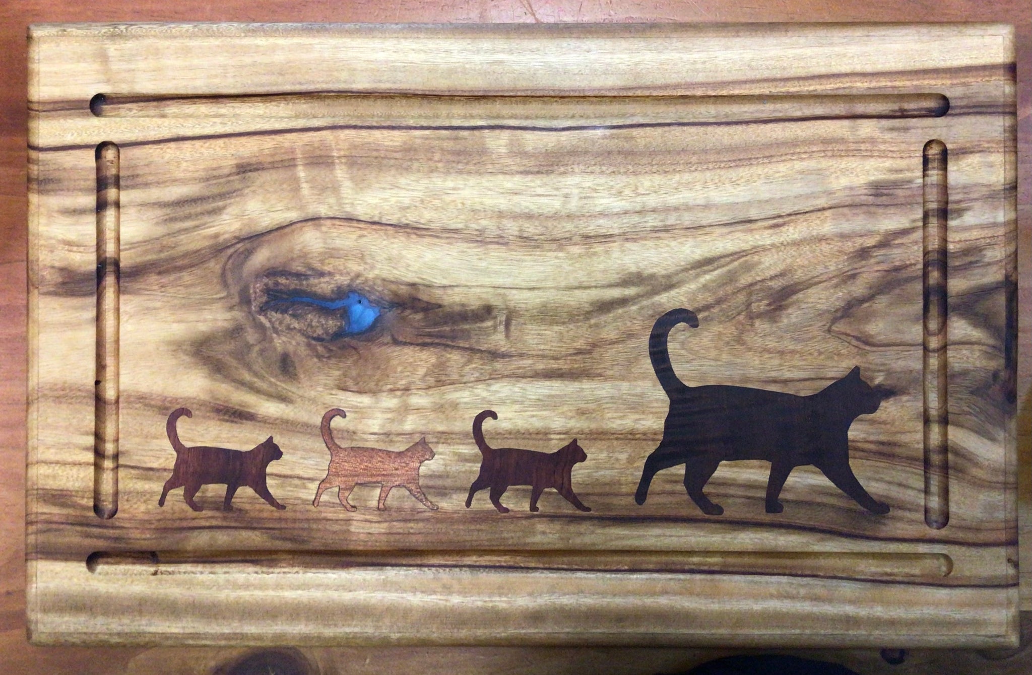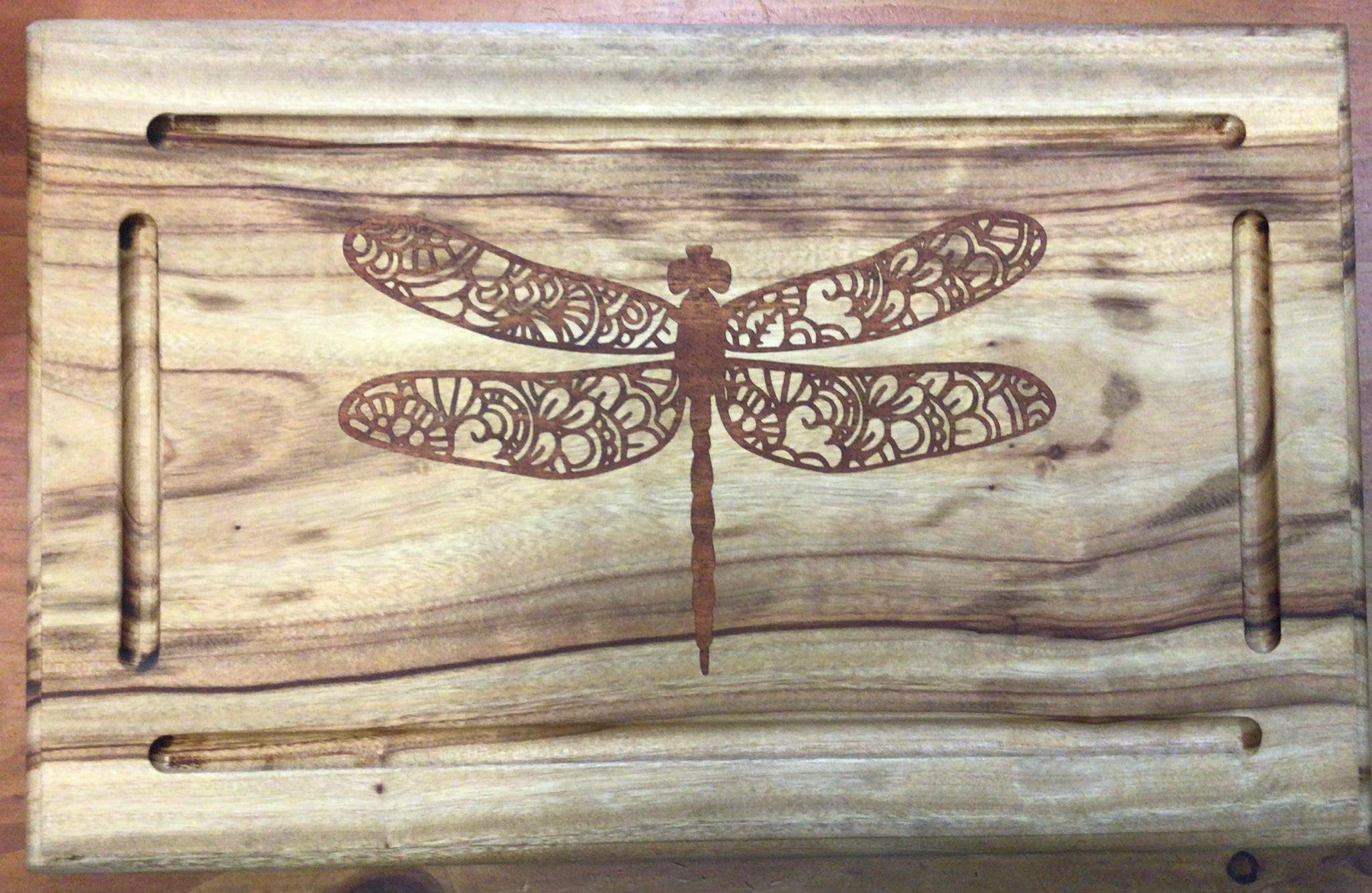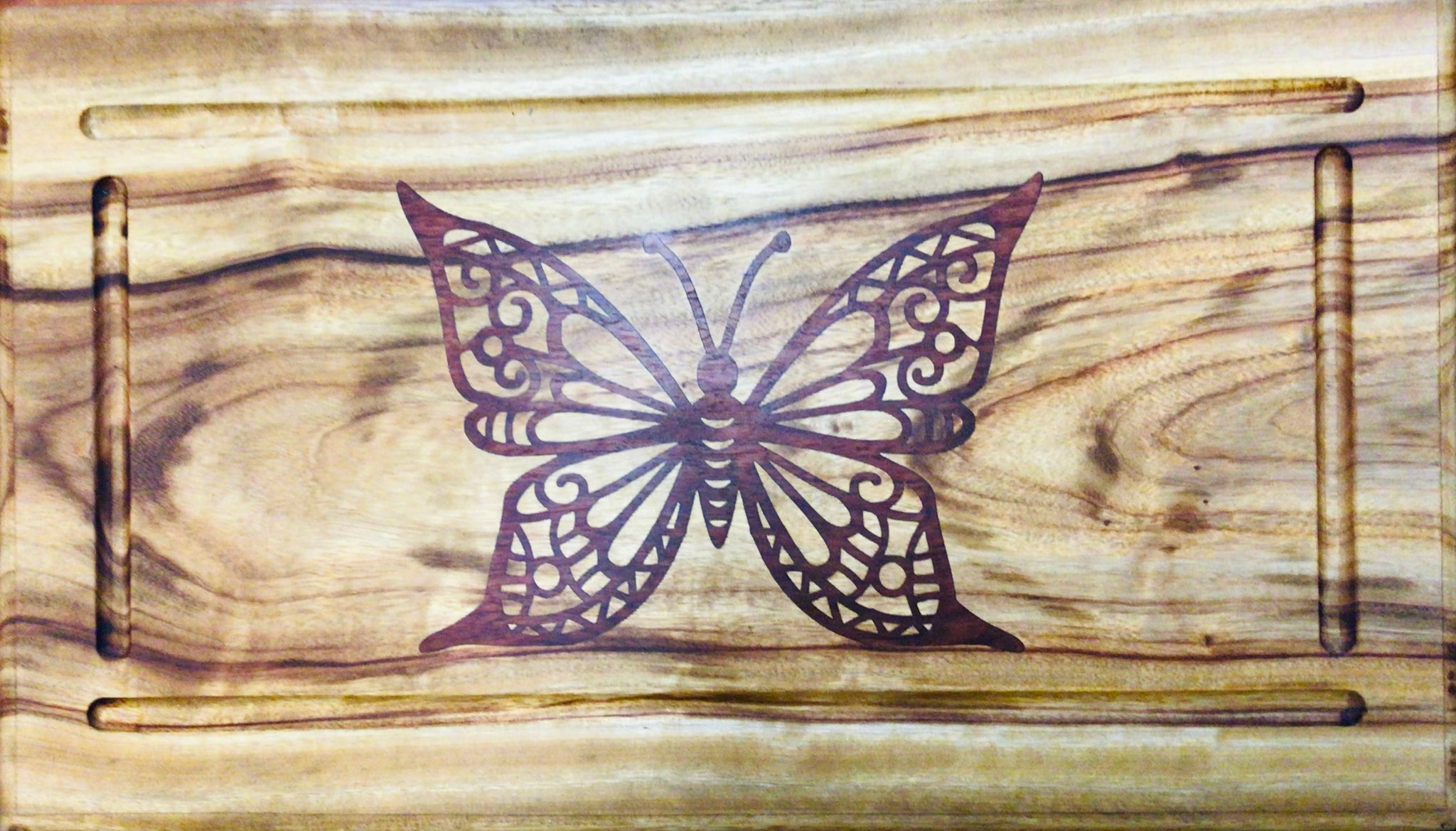 My boards are manufactured here in Woodgate. I use Australian Camphor Laurel slabs as my standard base board. The boards are first shaped and sanded. Then I laser engrave an image into the timber and cut an inlay to glue into the engraving.